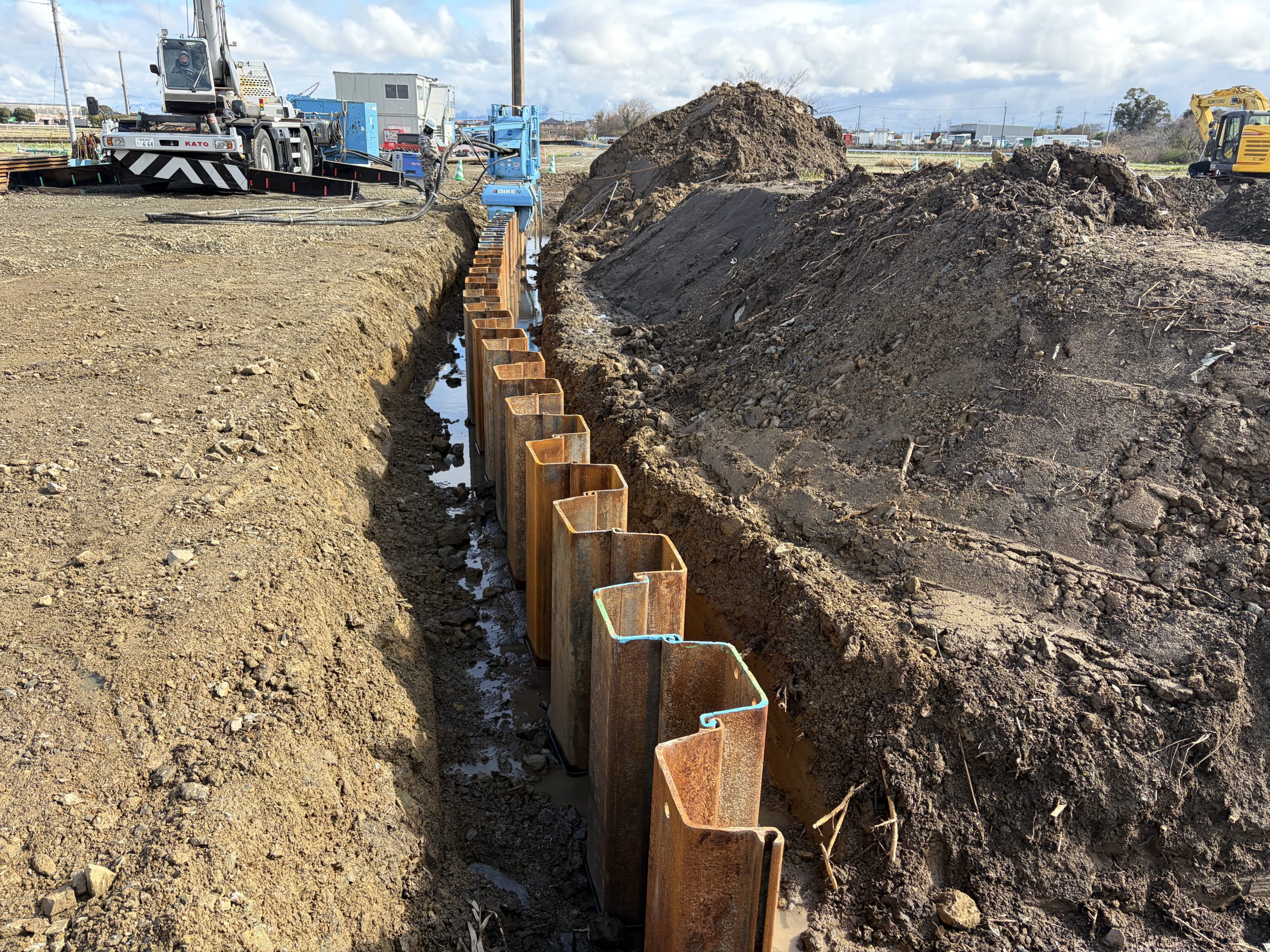→ クレーンで鉄の板(矢板)を持ち上げて運びます